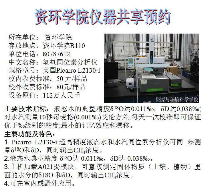 资环学院的大型仪器氢氧同位素分析仪已添加到欧美色情 贵重精密仪器共享预约系统,现在可在网上预约后使用仪器。欢迎校内外老师及同学们预约使用。